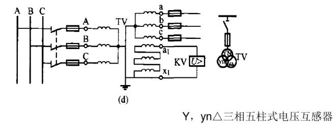 4.一臺(tái)三相五芯柱電壓互感器接成YN/YN/Δ(開口三角形),如圖1(d)所示。接成Y0形的二次線圈供電給儀表、繼電器及絕緣監(jiān)察電壓表等。輔助二次線圈接成開口三角形,供電給絕緣監(jiān)察電壓繼電器。當(dāng)三相系統(tǒng)正常工作時(shí),三相電壓平衡,開口三角形兩端電壓為零。當(dāng)某一相接地時(shí),開口三角形兩端出現(xiàn)零序電壓,使絕緣監(jiān)察電壓繼電器動(dòng)作,發(fā)出信號(hào)。