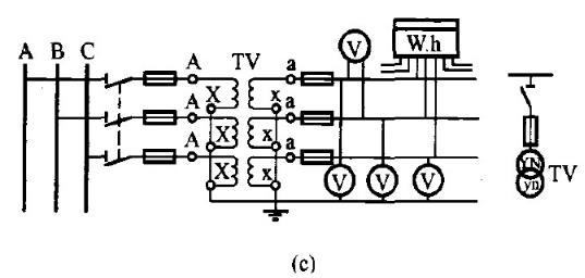 3.三個(gè)單相電壓互感器接成YN/YN形,如圖1(c)。可供給要求測量線電壓的儀表和繼電器,以及要求供給相電壓的絕緣監(jiān)察電壓表。